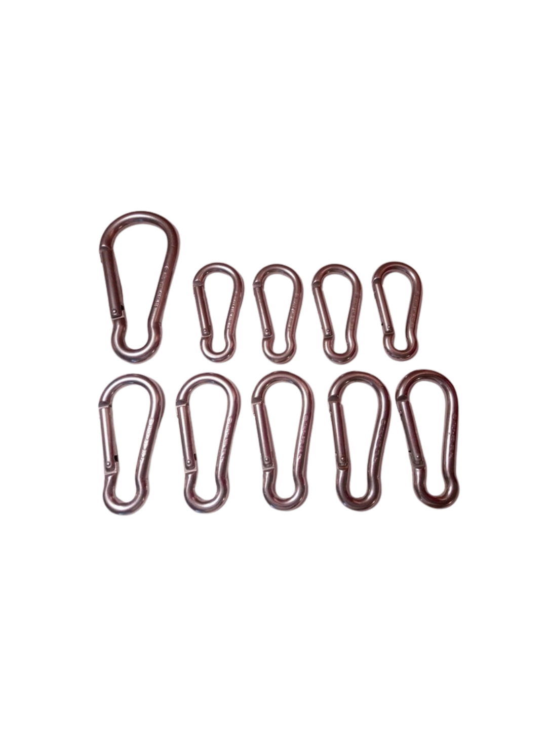 Mosquetones metálicos de alta resistencia, diseñados para acoples de seguridad y aplicaciones industriales. Duraderos, seguros y fáciles de usar.